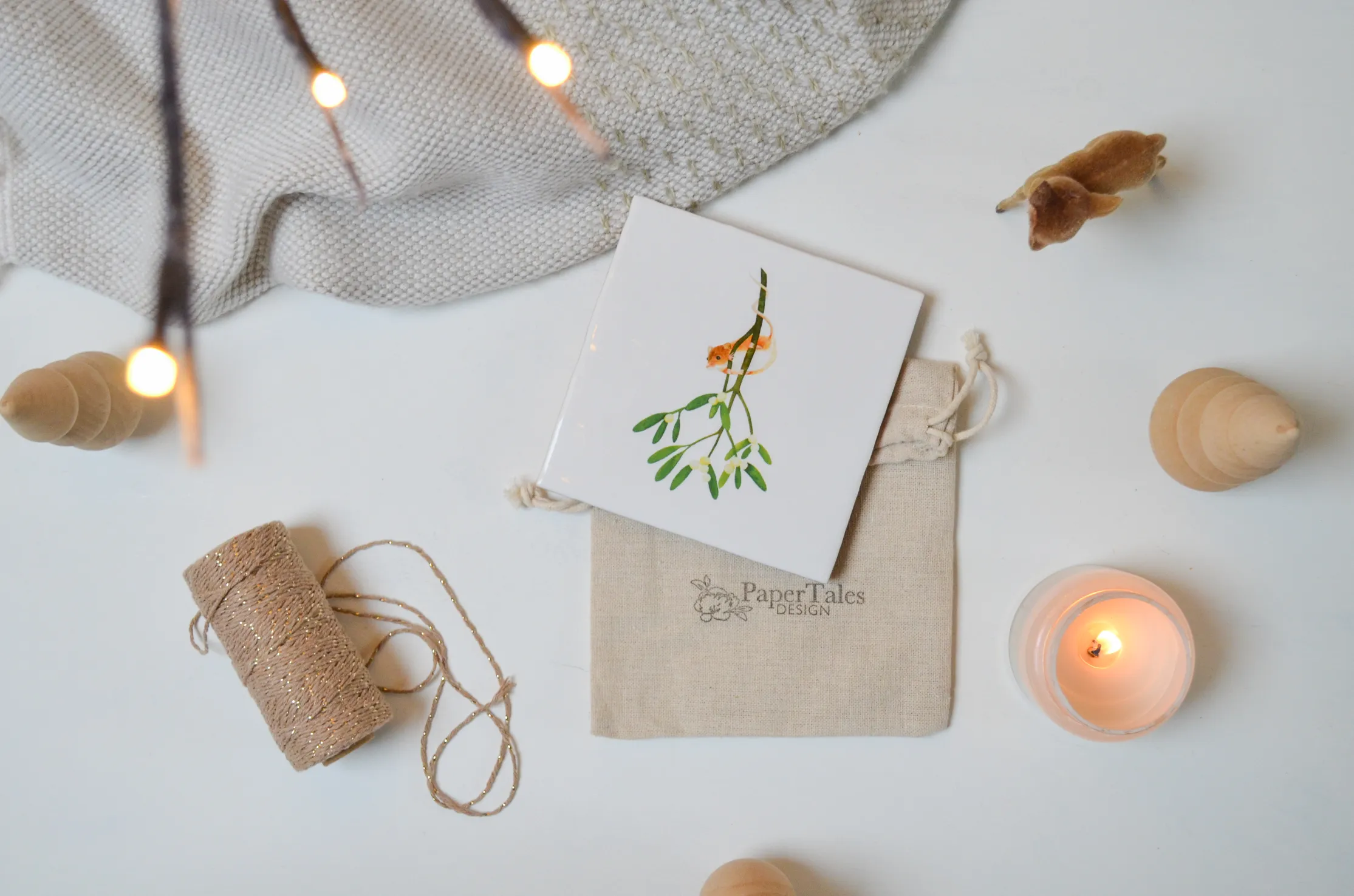 Het is makkelijk om overweldigd worden door het aanbod kerstballen, lampjes en kerstdecoratie in de winkel. Ons advies is: houd het simpel. Kies voor een thema of een bepaalde kleur. Zo houd je het ook rustig. Met ons kerst tegeltje van een veldmuisje in een maretak, heb je bovendien originele kerstdecoratie aan de muur.