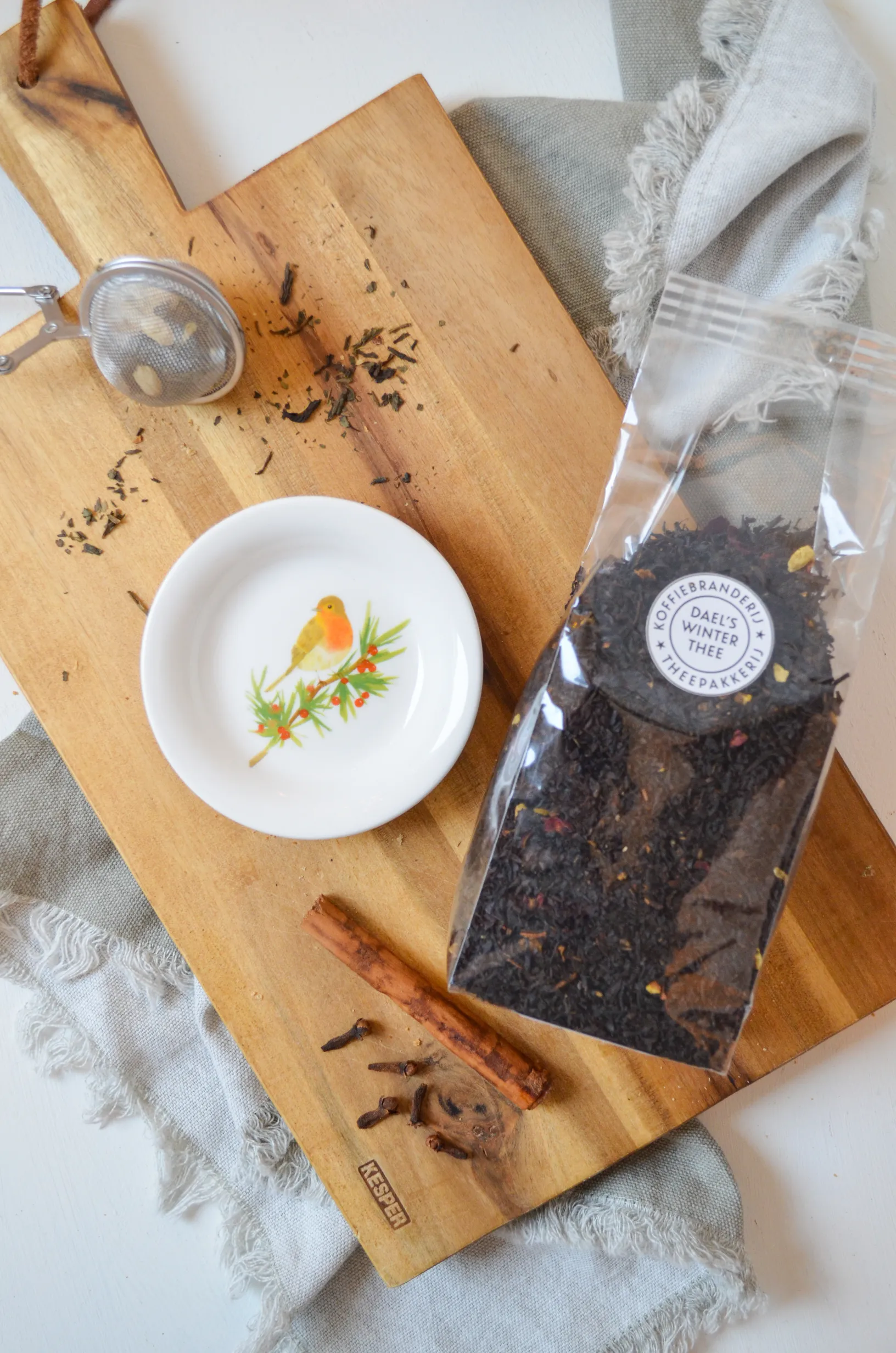 Je hebt liefhebbers van koffie, en je hebt liefhebbers van thee. Maar ookal ben je meer ’team koffie’, de heerlijke thee van Blanche Dael (koffiebranderij en theepakkerij uit Maastricht) vindt iedereen lekker! Dit theepakket bevat daarnaast een schaaltje met winterse illustratie om je theezakje/thee ei op te leggen als de thee klaar is, of is ook heel handig voor dat stukje chocolade bij de thee…